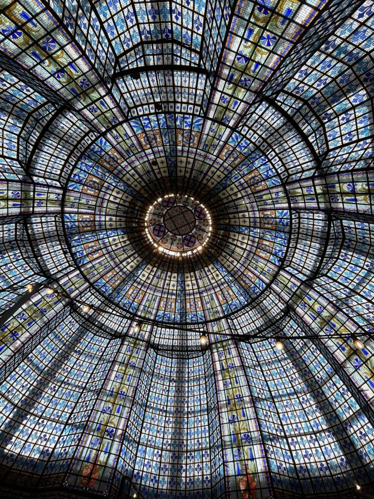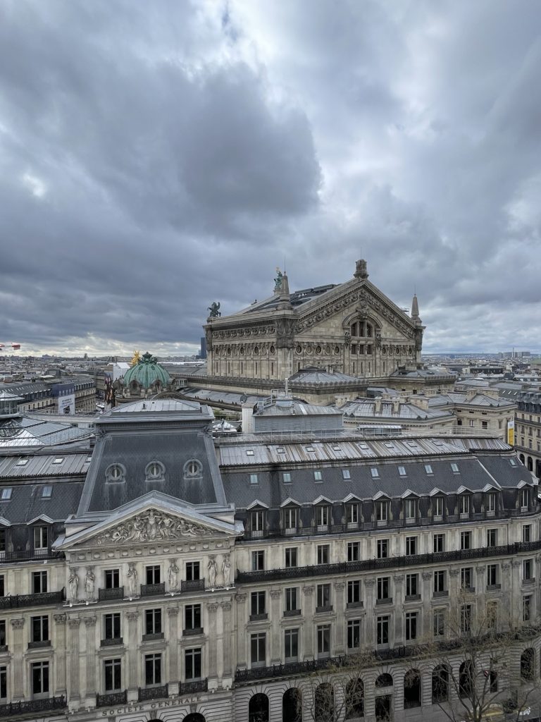 We start out to see things we couldn’t afford at Galleries Lafayette and Printemps. Beautiful stores, both with incredible stained glass domes. It’s always fun to see what a $3000 outfit looks like. Lafayette now has a rooftop viewing terrace so we went up for a peek. Great views of the opera house and Paris.