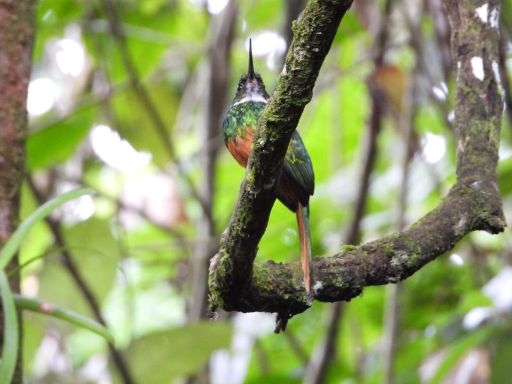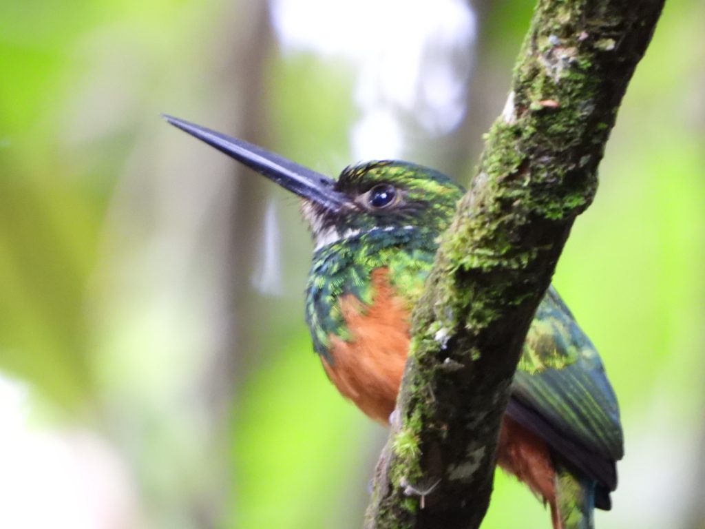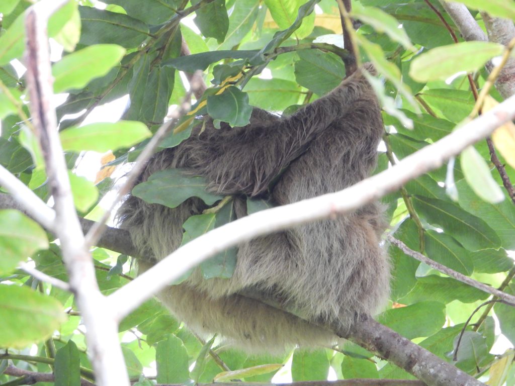 Facts learned: 1. sloths come down the tree to poop. If they do it up high, it spreads their scent to predators. 2. Sloths do one thing fast – mating. 3. The rufous-tailed jacamar is the largest humming bird.
